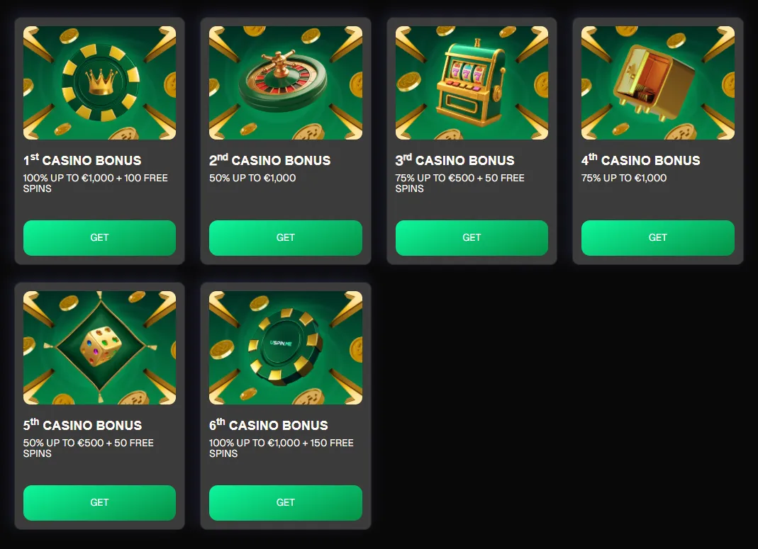 What welcome bonus can I claim at USpin?Uspin Casino new players receive up to €5,000 plus 350 free spins distributed across their first six deposits. The bonus structure starts with a 100% match up to €1,000 and 100 free spins on your first deposit, followed by additional bonuses on subsequent deposits with varying percentages and free spin allocations.